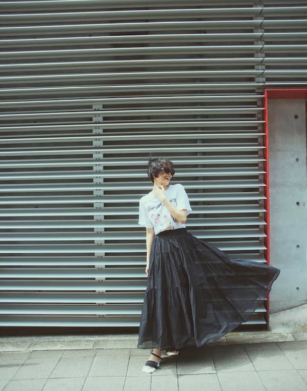 スカート¥30,800(マリリン ムーン/DEUXIÈME CLASSE 青山店)、Tシャツ¥18,700(アンフォーチュネイト ポートレイト/ウィム ガゼット ルミネ新宿店)、シューズ¥13,970(シー ユナイテッドアローズ/ユナイテッドアローズ カスタマーサービスデスク)、サングラス¥35,200(ウェイティング フォー ザ サン/リーンスプリング)