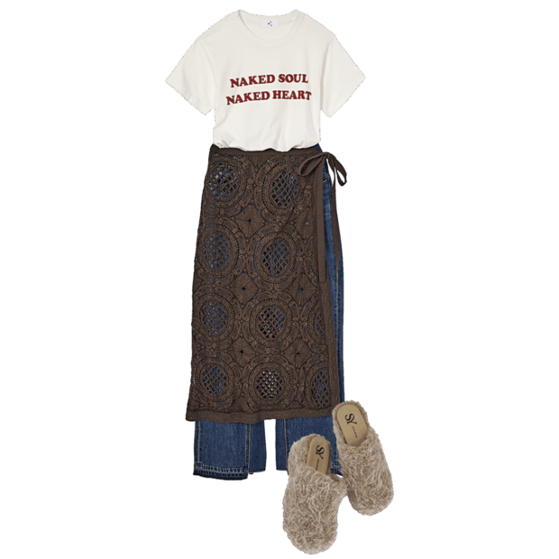 ラップスカート¥25,300(ノーメント/ショールーム セッション)、Tシャツ¥8,800(トウキョウ ウィークリー ジャーナル/バロックジャパンリミテッド)、デニムパンツ¥16,500(サロン アダム エ ロペ)、シューズ¥13,970(シー ユナイテッドアローズ/ユナイテッドアローズ カスタマーサービスデスク)