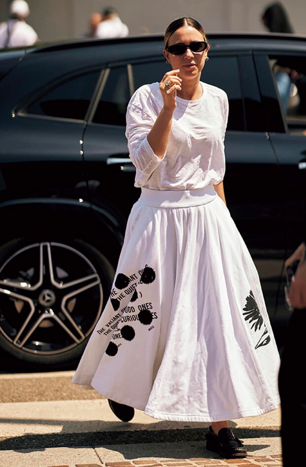 適度にハリを持たせたコンテンポラリーな生地がまさに大人仕様のスカート。たっぷりとしたボリューム感が仰々しく見えることなく、むしろ都会的でスタイリッシュに映る、こんな質感を選ぶのが決め手です。Tシャツコーデにほんのりとエレガンスを添えて。