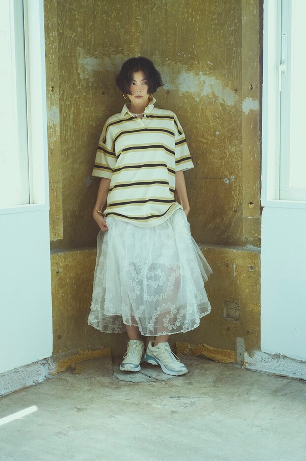 ドレス¥26,400(メゾンスペシャル/メゾンスペシャル 青山店)、ポロカットソー¥17,600(ザ ポーズ/ウィム ガゼット ルミネ新宿店)、スニーカー※別注¥19,800(サロモン/ロンハーマン)、ピアス¥59,400、バングル¥111,100(共にマリア ブラック/マリア ブラック 表参道店)