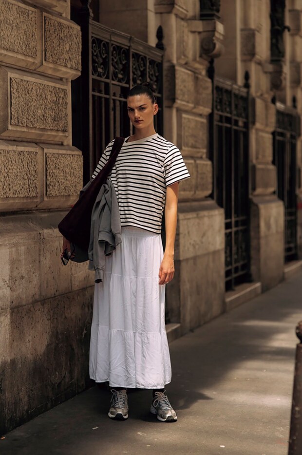 スカート選びは、リゾートではなく、オケージョン寄りのドレッシーな方向に振るのも手。カジュアルなトップスとのミックスマッチが新鮮に映ります。