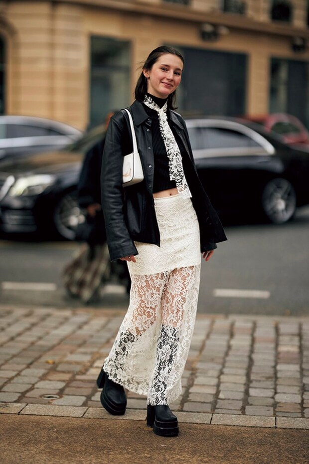 スポーティMIXや黒レザーで、王道ホワイトの甘さをクールダウンした着こなしが目立ったレース。シアーな質感をうまく生かしてモード寄りに仕上げて。