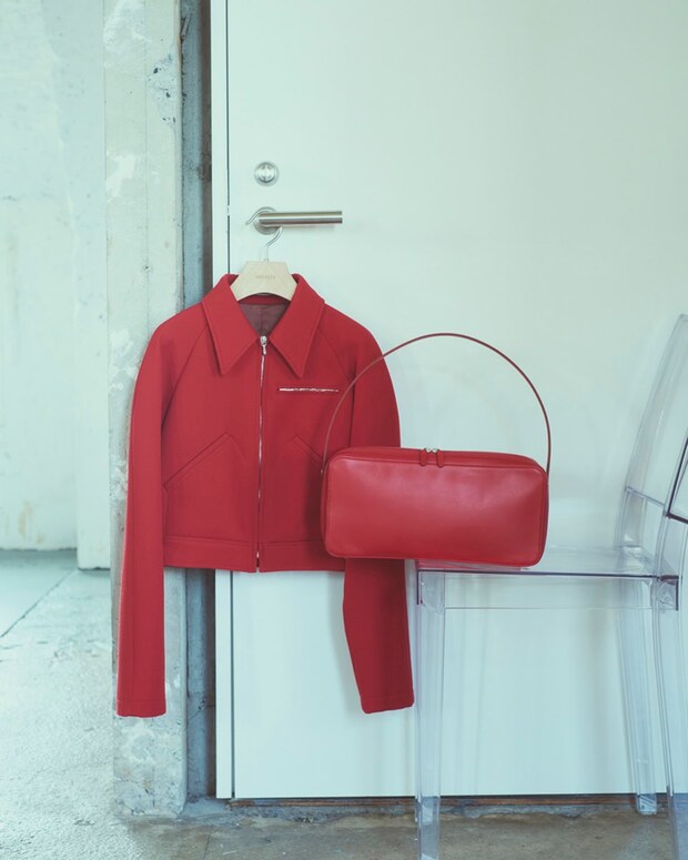 今季らしいトマトレッドに染められたショートブルゾンとカウレザーのバッグ。一見キレイめな印象でいて、どちらも日常着にさらりと+αできる懐の広さがさすがのオーラリー。
