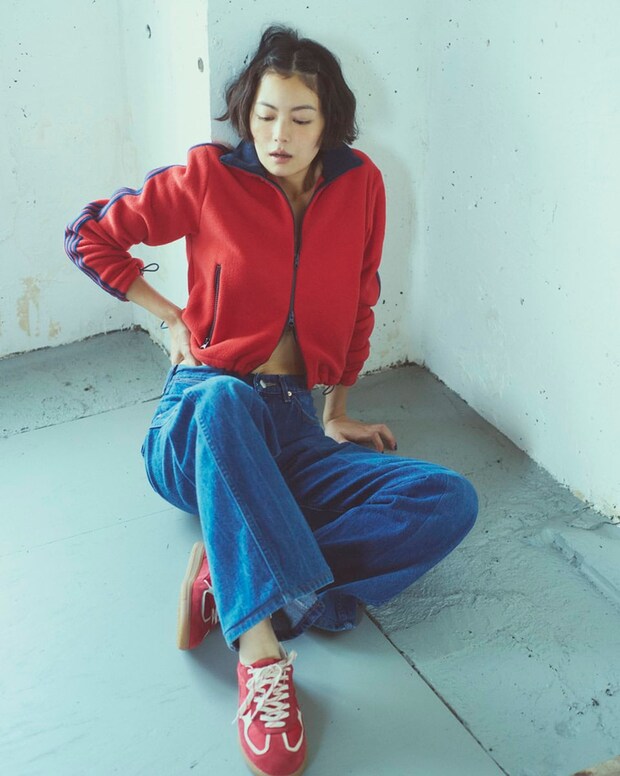 赤といえばのスポーティMIX。大人ならではの遊び心を交え、あえてのフリースで。秋のテンションを反映させたショート丈を選べば、これが意外に可愛くおしゃれに着られます。