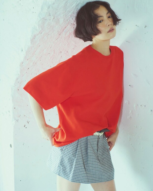 詰まったネックラインにワイドな身頃、いい具合にルーズで半端な丈感の袖。見れば見るほどサイジングの妙が可愛いニットT。肌がパッと明るく見えるオレンジ寄りの朱赤も新鮮。