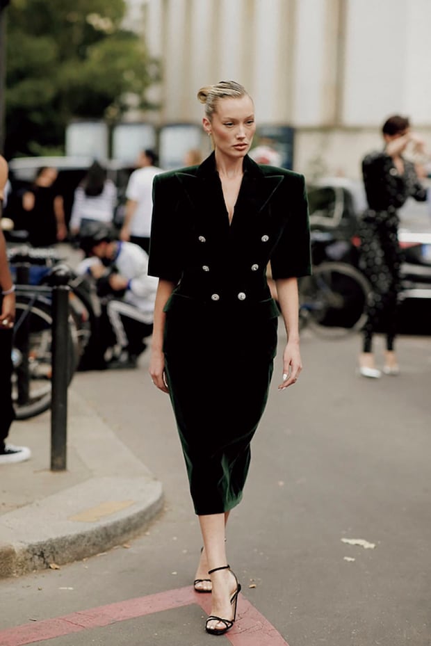 フォーマル要素強めのベロアなら、肌感多めの装いも上品さをキープ。ということで、ベロアの魅力を遺憾なく発揮できる、暑さの残る今を逃すことなくトライして!