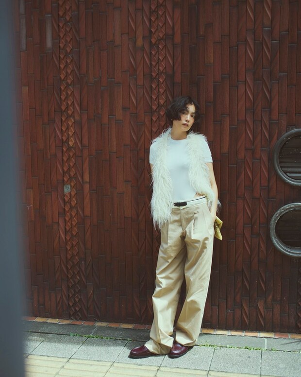 懐かしのフォークロアでもコンサバでもなく、ピタTにタックパンツでローファーみたいな、今の時代のニュートラルなおしゃれにファーを足すのがオトナミューズ読者世代の最適解。裏地ナシ、軽アウター感覚でさっとまとえる、こんな感じのファーがジャスト。
