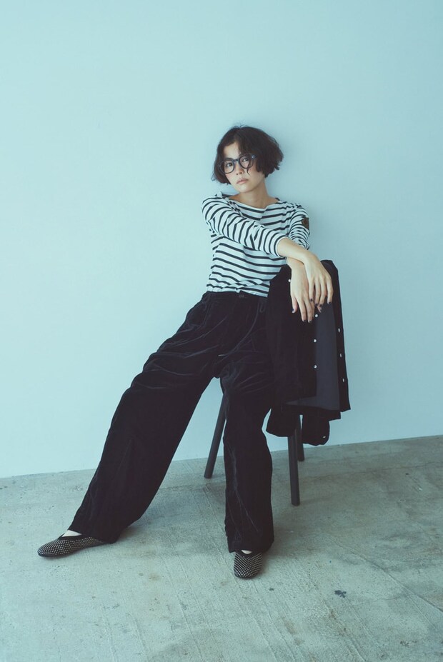 夏のスタメンだったスラックスから、ノーブルな光沢のあるベロアパンツにスイッチ。フロント2カ所にあしらわれたドロストと、薄手かつ軽やかなレーヨンベルベット生地による、こなれたシルエットがナイスな1本。ボーダーTに秋のムードとリッチ感を添えて。