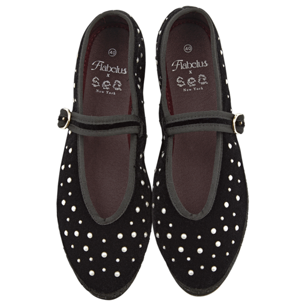 パールが輝くメリージェーンは、伝統的かつサステナブルなエスパドリーユで人気を博すフラベルスとの注目コラボ。
