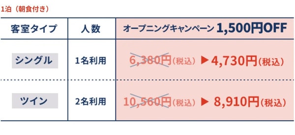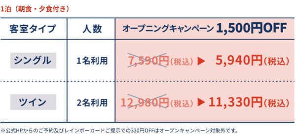 期間中、1室あたり通常料金より1,500円(税抜)割引にて宿泊することができる。