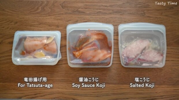 TastyTimeさんは、竜田揚げ・醤油こうじ漬け・塩こうじ漬けの3種類の下味をつけていました。竜田揚げには、しょうが・日本酒・しょうゆを各大さじ1ずつ、醤油こうじ漬け・塩こうじ漬けには各こうじを1切れあたり大さじ1~2を加えて揉み込みます。あとは冷蔵庫もしくは冷凍庫にいれるだけ!冷蔵なら2~3日、冷凍なら2~3週間を目安に食べるようにしましょう。