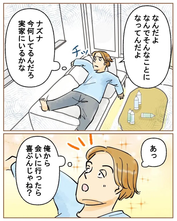 家に帰ったツカサさんは、「なんだよ。なんでそんなことになってんだよ」と文句を言いながら、「ナズナ、今何してるんだろ。実家にいるかな」と呟くと、「あっ、俺から会いに行ったら喜ぶんじゃね?」と勝手に名案だと思いつきました。