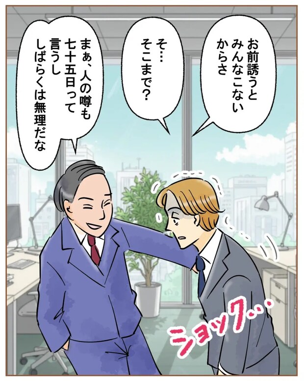 さらに、「お前誘うとみんな来ないからさ」と言われ、「そ・・そこまで?」とショックを受けるツカサさんに、「まぁ、人の噂も七十五日って言うし、しばらくは無理だな」と追い討ちをかけるように言いました。