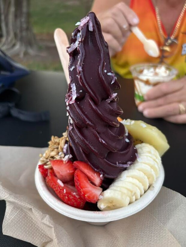 今回は夫はキャラメル味のソースがかかったクッキー入りのスイーツアイスクリームを注文し、私はアサイボウルを注文しました。