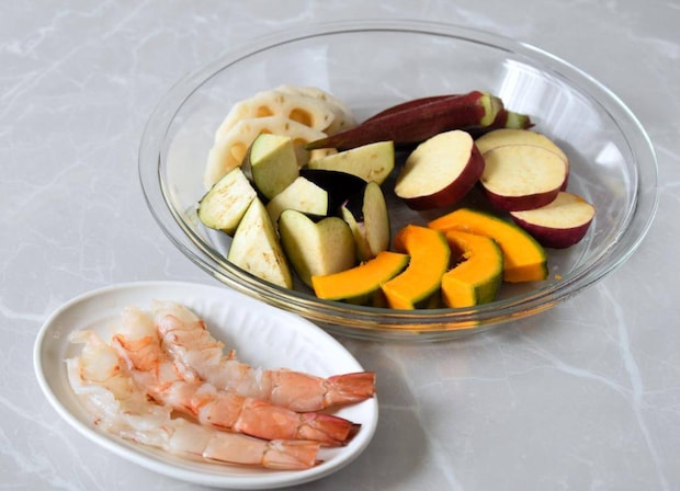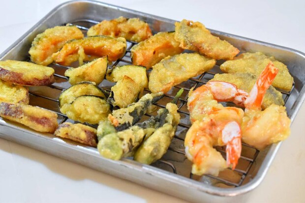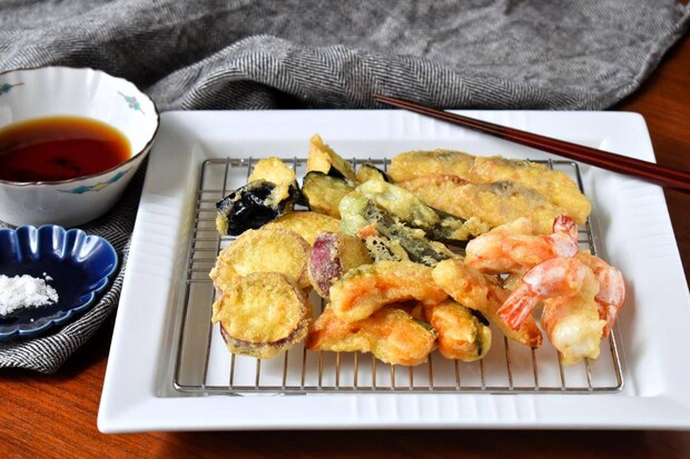 衣に具材をくぐらせて、175~180℃に熱した油で揚げます。衣を少量鍋に落とし、途中まで沈んですぐに浮き上がれば適温です。