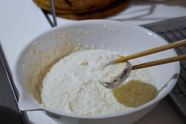 ボウルに絹豆腐と片栗粉を全量入れ、よく混ぜ合わせて衣を作ります。具材が絡みやすいやわらかさになるまで、水(分量外)を少量ずつ加えて調整します。