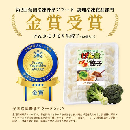 「げんきモリモリ生餃子」は、品質と社会貢献性が高く評価され、「第2回全国冷凍野菜アワード」の調理冷凍食品部門にて金賞を受賞した。
