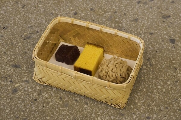 「余々間(よよま)」は、ココナッツを練りこんだ羊羹、卵黄をたっぷり使用した五三焼きのカステラ、そして聴景居で人気の季節きんとんの3種が用意されている。