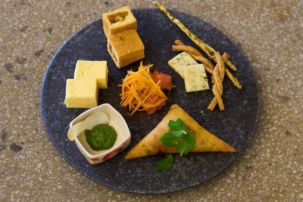 「茶塩気(ちゃじょけ)」では、7種類が楽しめる。台湾で人気の自家製パイナップルケーキ、日本や韓国で人気のあおさを使ったクラッカー、東南アジア香るココナッツクッキーのほか、中国の発酵食品である豆鼓と黒胡麻のスティック、じゃが芋のインド風サモサにミントとコリアンダーソース添え、日本で親しまれている昔懐かしい玉子焼き、そしてリンゴ酢に漬けた人参に果物を合わせた箸休めが揃う。