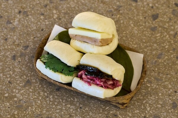 「包々(ほうほう)」は、マントウ3種が用意されている。台湾で人気の高菜とパクチー、中国の胡麻団子と日本のあんバター、そしてベトナムのバインミー風の紫キャベツと季節の芋を挟んだマントウが並ぶ。