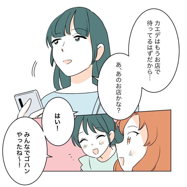 お店の近くに来たタイミングでシズクはスマホを見ながら「カエデやっぱりちょっと遅れるんだって。先にご飯食べて待ってようか」と娘たちに伝えました。