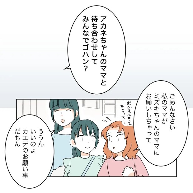 シズクは、カエデに頼まれてアカネを迎えに来たと娘たちに話し、後からカエデと待ち合わせをして食事するのだと伝えました。シズクを100%信用しているアカネは「ごめんなさい、私のママがミズキちゃんのママにお願いしちゃって」と言うと、シズクは「いいのよ、カエデのお願い事だもん」と微笑みました。