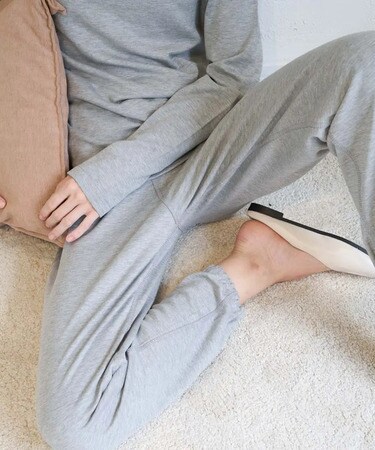 ウエストと足口に細めのゴムを入れたやさしい仕様になっており、裾が上がってきにくいので、眠っている間も安心だ。