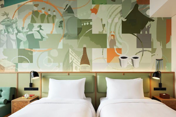 客室はスタンダード、ハイフロア、デラックス、スイートで構成され、機能的な収納やセルフセレクト発想のアメニティに加え、セルフチェックイン・チェックアウト機、快適なWi-Fi環境、ストリーミング対応TV、フィットネスルームなどを備えた現代の旅スタイルに寄り添う設計。遊び心あるアートやグラフィックを随所に配し、街の文脈を感じられるインテリアに仕上げられている。