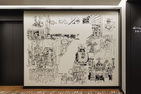 客室やコミュニティラウンジに、兜町のモチーフを取り入れた色彩豊かで大胆なアートを手掛けたMOTAS.(モータス)や、客室バスルームや1階のギャザリングスペース、エレベーターホールに街の風景や人々の営みを軽快で温かみのあるタッチで描いたAdrian Hogan(エイドリアン・ホーガン)などホテルの随所にアートやグラフィックスが配置されてる。田中紳次郎さんは、フィットネスジムの壁画で黒い線を金融の動きや細胞のリズムになぞらえ、循環とエネルギーを表現。Straft(ストラフト)はスイートルームで、兜町という街そのものをひとつの巣=NESTと捉え、日本の伝統に深く根差した素材である稲わらと、金属を融合したインスタレーションを製作した。