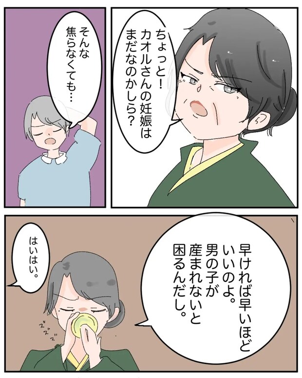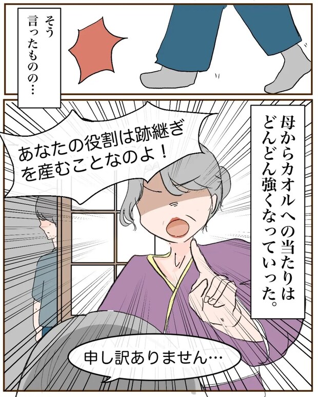 そして、母の催促はカオルへも。母からカオルへの当たりはどんどん強くなっていきました。「あなたの役割は跡継ぎを産むことなのよ!」と母から強く迫られるカオルを見ても、自分にイライラをぶつけられるのが嫌で何も言えませんでした。