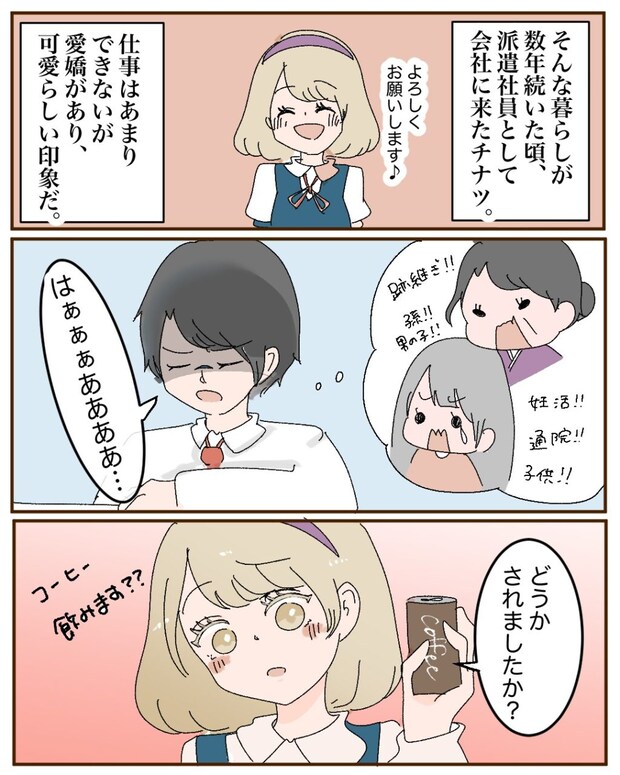 そんな暮らしが数年続いた頃、派遣社員として僕の会社に来たのがチナツでした。仕事はあまりできませんでしたが、愛嬌があり可愛らしい印象の女性でした。家では母から跡継ぎを催促され、なかなか妊娠できず追い詰められているカオルからも子どもの話しばかりされストレスが募っていた頃でした。会社で「はぁぁぁぁぁ」と大きな溜息をついていた俺に、チナツが「どうかされましたか?コーヒー飲みます?」と心配そうに声をかけてくれました。