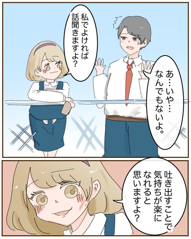 「あ・・いや・・なんでもないよ」と誤魔化そうとすると「私でよければ話聞きますよ?吐き出すことで気持ちが楽になれると思いますよ?」と優しく言ってくれました。