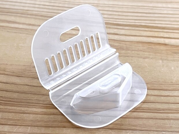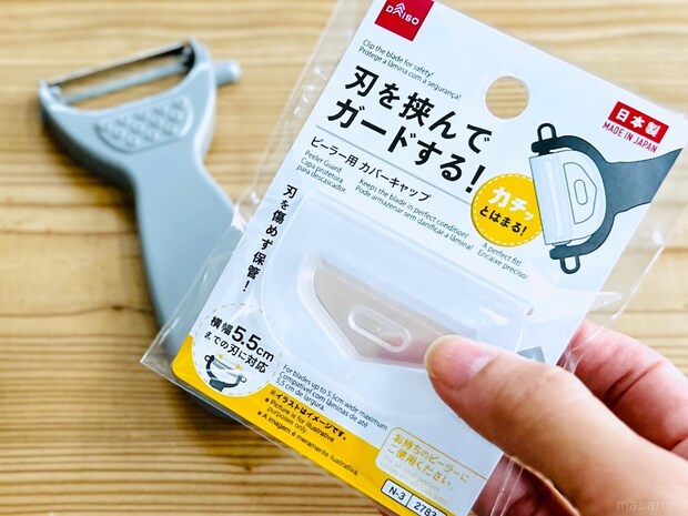 ダイソーの「ピーラー用 カバーキャップ」は、ピーラーの刃を挟んでガードできるアイテム。横幅5.5cmまでの刃に対応しています。