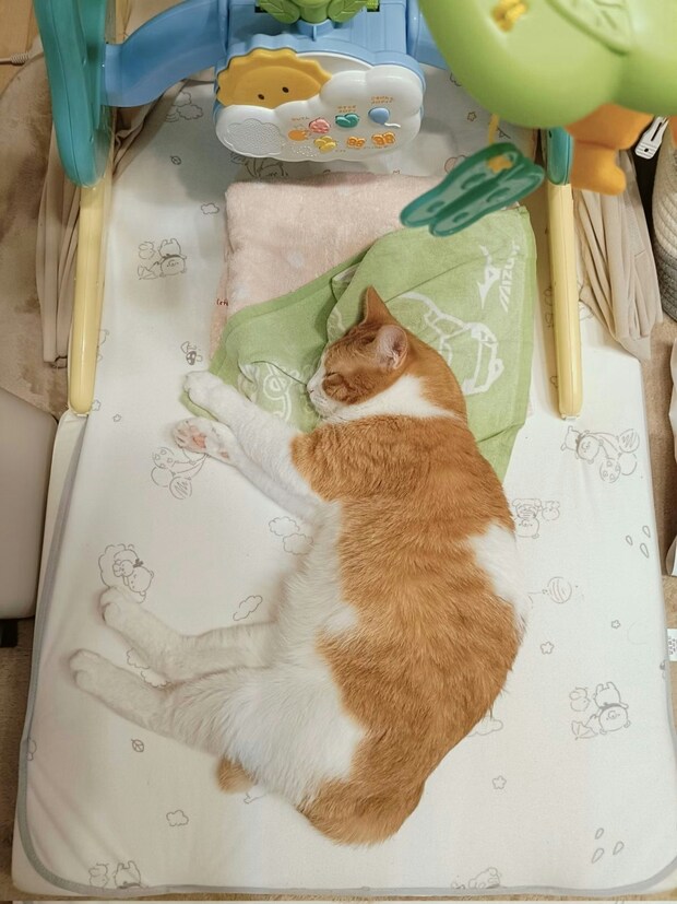 にーこ*☺︎🎀10.5生(@neeko_aka)さんの投稿です。猫はあたたかいところが好きですよね。また、家族のぬくもりを感じられるところが、一番好きなのではないでしょうか。赤ちゃんが生まれたにーこ*☺︎🎀10.5生さんの家にいる猫ちゃんには、お気に入りの場所がありました。