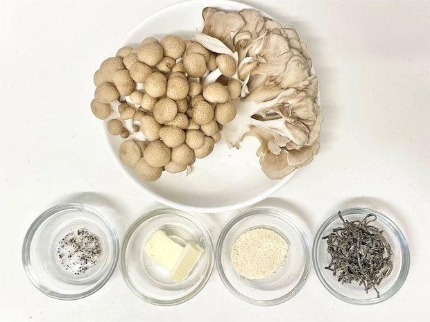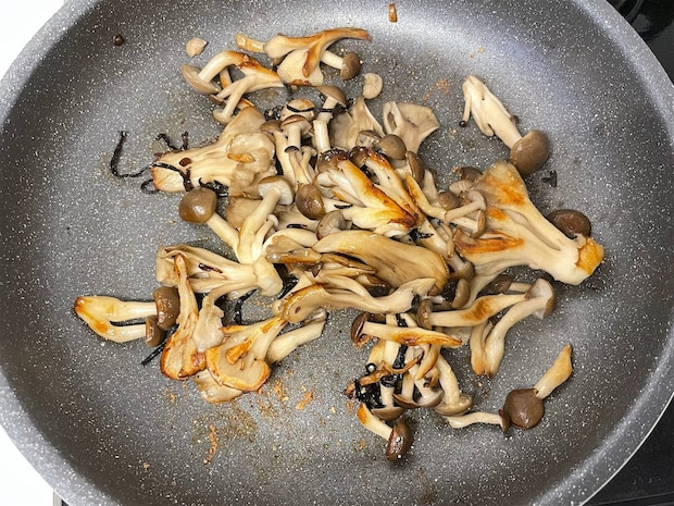 1. フライパンにバターを入れ、中火で熱し、舞茸、しめじを軽く焼き色がつくまで炒めます。