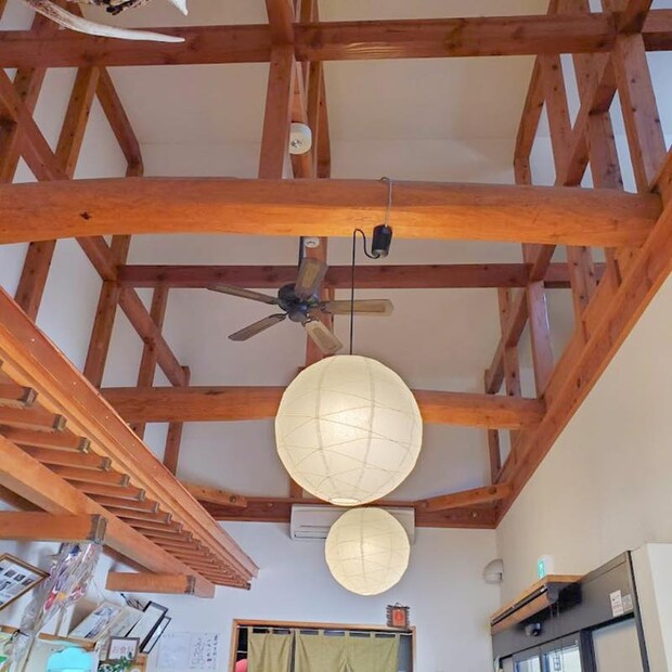 店内に入ってまず目を奪われるのは、高い吹き抜け天井に組まれた立派な木梁と、そこに吊るされた丸い照明の温かな光。