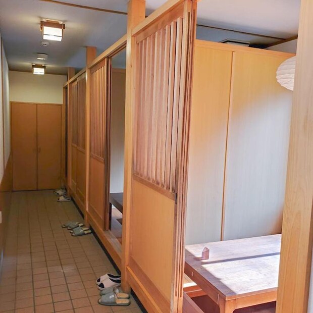 奥には、靴を脱いでゆっくりくつろげる個室風の座敷席が並び、格子戸で仕切られた落ち着いた雰囲気。