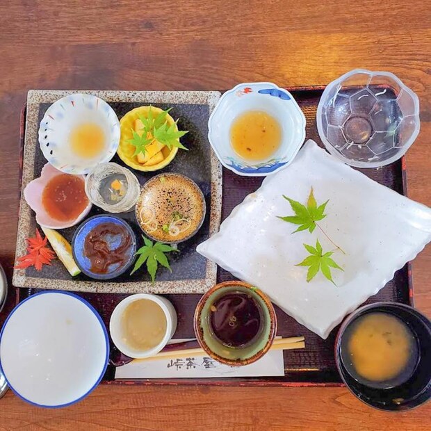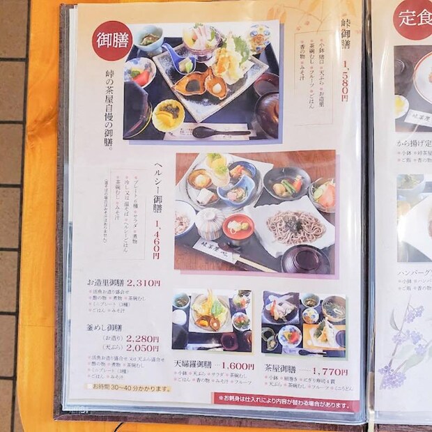 お店の看板メニューである「峠御膳」は、ご飯・汁物・漬物・小鉢が揃い、旬の食材をたっぷり使っていて、和食の醍醐味をしっかり味わいたい方に最適な逸品です。