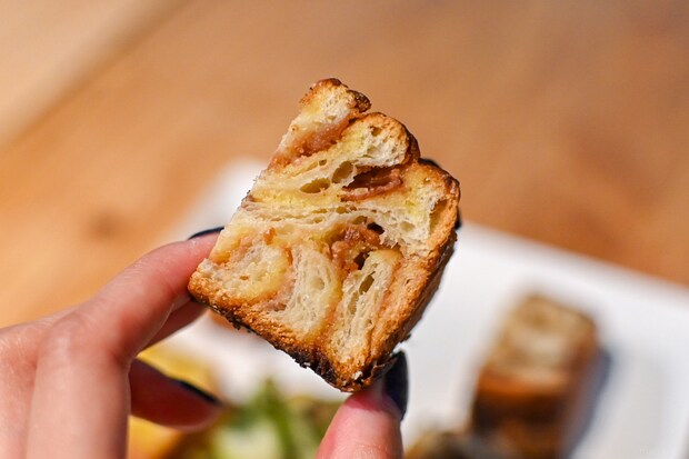 ひと口食べた瞬間、しっとりとした生地の食感とともにピーナッツバターの濃厚な風味を楽しめます。イチゴジャムの酸味やバナナの甘みもあり、塩気のあるベーコンの味わいも重なった、ほかではなかなか出会えない複雑な味わい。一度食べたらやみつきになりますよ。