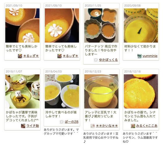 つくれぽ(作りましたフォトレポートのこと)にも「何度もリピしてます。簡単なのにとってもおいしくてお気に入り」「家族に大好評でした!今度、サツマイモに変えて、作ってみます」「マシュマロ消費に!生クリームと豆乳で濃厚おいしい」など嬉しい声がたくさん届いています。