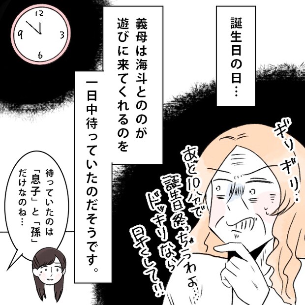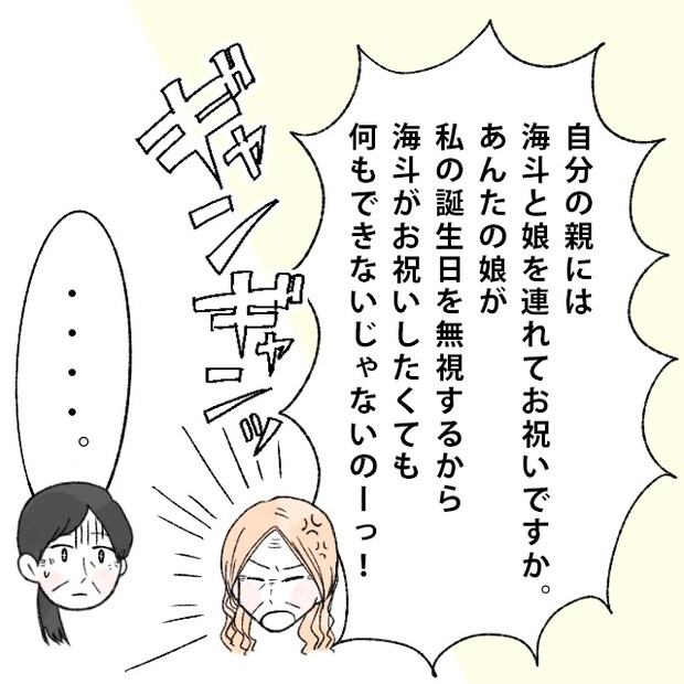 すると、「自分の親には海斗と娘を連れてお祝いですか。あんたの娘が私の誕生日を無視するから、海斗がお祝いしたくても何もできないじゃないのーっ!」とギャンギャン叫ぶ義母にお母さんはドン引き。