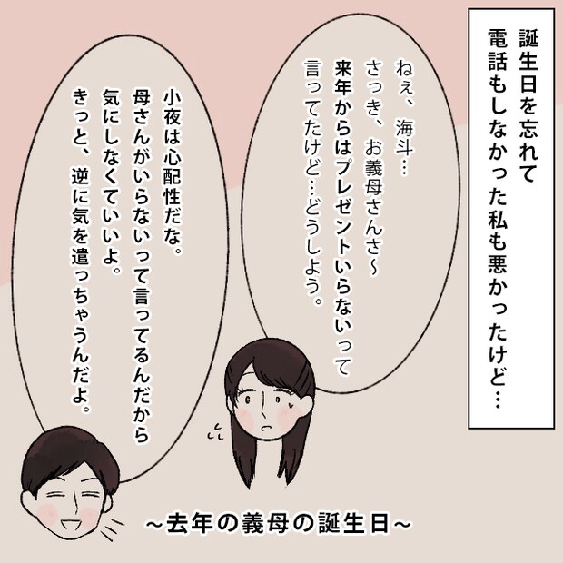 誕生日を忘れて、電話もしなかった私も悪かったけど・・そう思いつつ、去年の義母の誕生日を思い出す私。「ねぇ海斗・・さっき、お義母さんさ~、来年からはプレゼントいらないって言ってたけど・・どうしよう」私の言葉に、「小夜は心配性だね。母さんがいらないって言ってるんだから気にしなくていいよ。きっと、逆に気を遣っちゃうんだよ」と海斗が笑顔で言いました。
