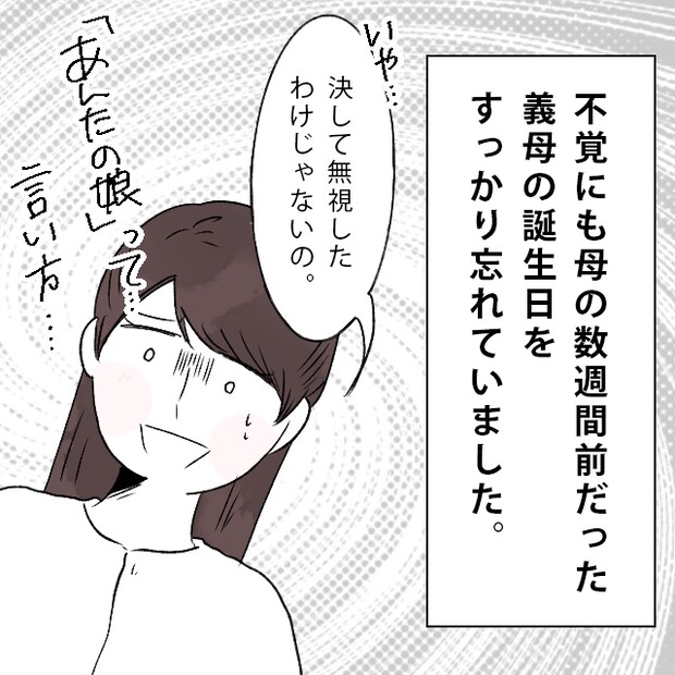 不覚にも、母の数週間前だった義母の誕生日をすっかり忘れていたのでした。「いや・・決して無視したわけじゃないの」と思いつつ、「『あんたの娘』って言い方・・」と複雑な心境に。