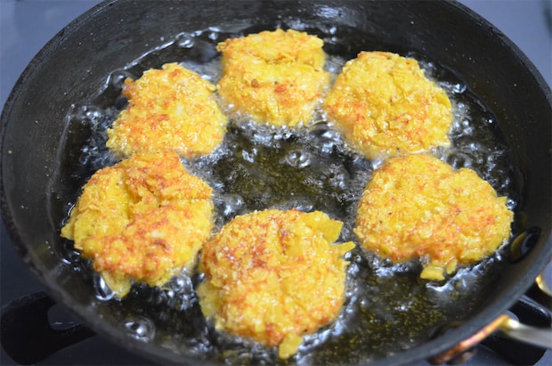 3. フライパンにサラダ油を1cmほど入れて170℃に温める。2を入れて5〜6分ほど片面ずつ揚げ焼きにする。