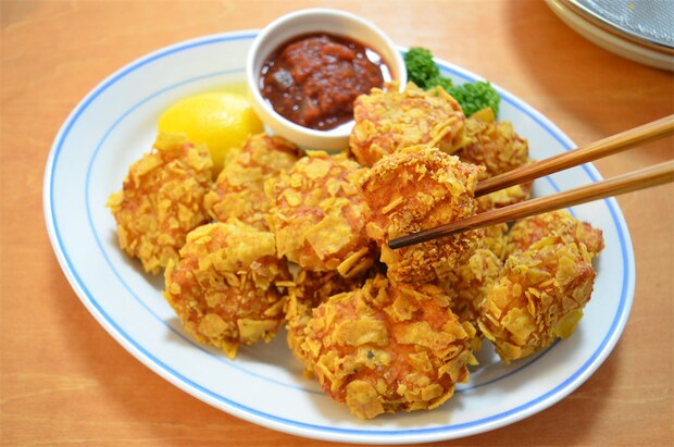 ドリトスの衣がザクザク食感でテンションUP。そして中はジューシーなふわふわ食感で絶品です。