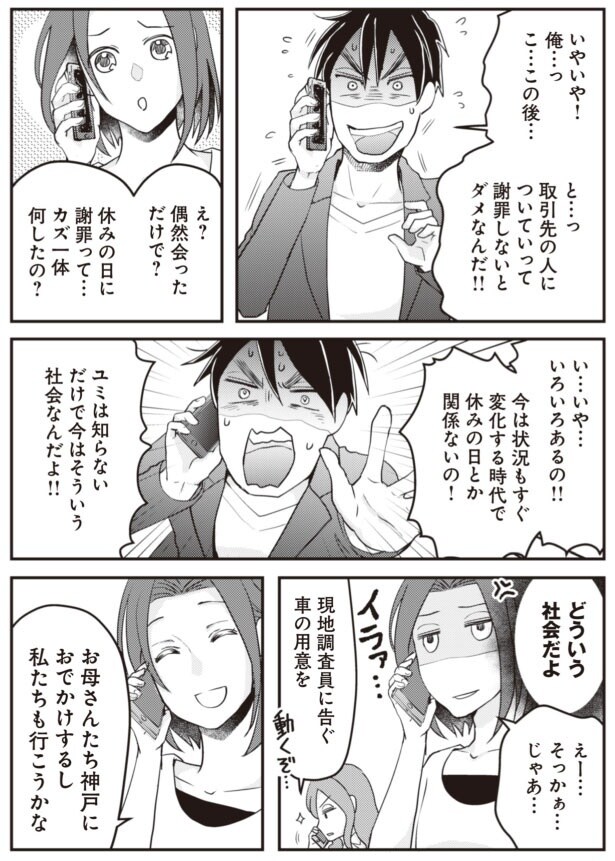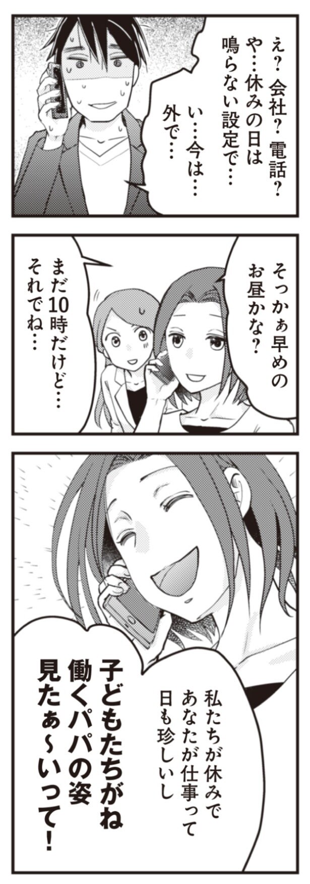 前回、夫の不倫旅行の中継を聞いたユミ。平然とユミに連絡をとってくる夫を少し揺さぶることにした。ユミは仕事だと嘘をついて不倫旅行に行っていた夫に「会社に電話したけど誰も出なかったよ」と電話し、反応を試す…。