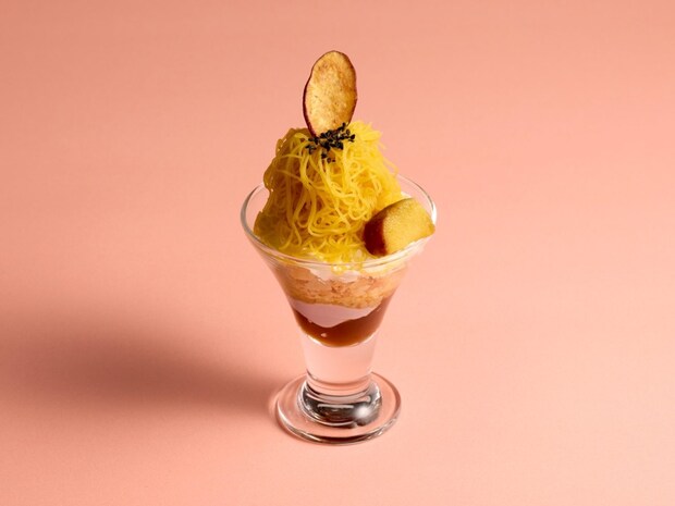 おいものモンブランをトッピングした、ミニサイズながらも満足感のあるパフェ。ねっとり甘いおいものペーストは、ホイップやバニラアイス、“紅はるか”の焼きいもと相性が良く、サクサクとしたクラッシュパイが食感にアクセントを加える。紅芋プリンの優しい甘みとすっきりとした風味のアップルティーゼリーで、秋を感じる柔らかな後味に仕上げている。香ばしい風味がおいもンブランとマッチする、ほうじ茶とのペアリングがおすすめだという。