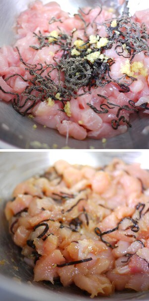 1cm角に切った鶏肉と塩昆布などを混ぜます。粘りが出てきたら十分に混ざったサインです。