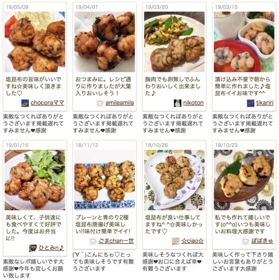 つくれぽ(つくりましたフォトレポートのこと)にも「漬け込み不要で朝から簡単に作れました◎」 「塩昆布が良い仕事してますね」などと、塩昆布のうまみを生かした調理手順と、でき上がった唐揚げの味を絶賛するコメントが多数寄せられています。