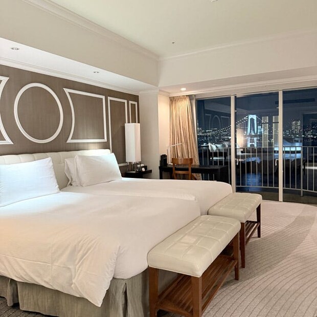 ツインデラックステラススイートは、お部屋の造りも贅沢。80㎡の広い空間はリビングルームとベッドルームに分かれ、ゆったりとくつろげる。プライベートバルコニーが2か所に付いているので、潮風を感じながら、時とともに表情を変えるベイビューを堪能しよう。屋外テラスに設けられているテーブルとチェアで、景色を眺めつつ2人で語り合うのもロマンティック。お部屋には50インチのワイドテレビやDVDに加え、いつでも淹れたてが味わえるコーヒーマシーンを完備。コーヒーの種類も豊富だから、お気に入りを味わいながら、大切な人と過ごす優雅なひとときを満喫して。
